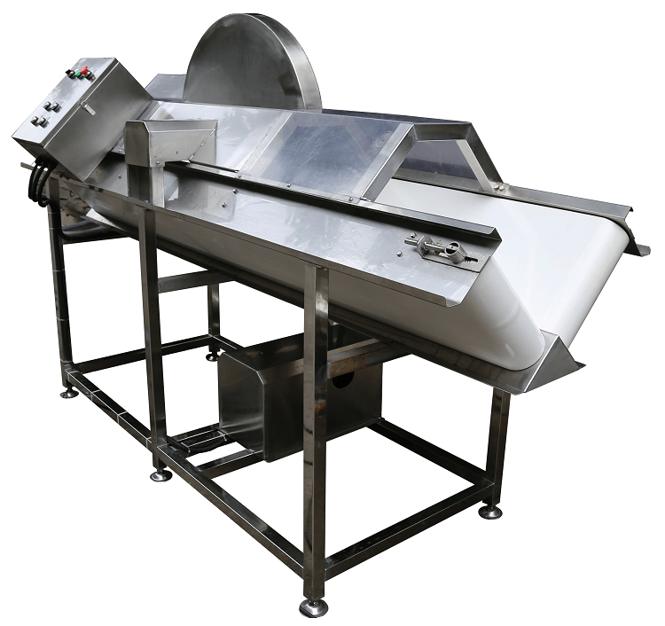 工作原理:將白菜連續(xù)不斷地放入80°夾角輸送帶上,在皮帶的傳遞,輪刀的旋轉(zhuǎn)下將白菜從中切開,來(lái)達(dá)到切半的目的。